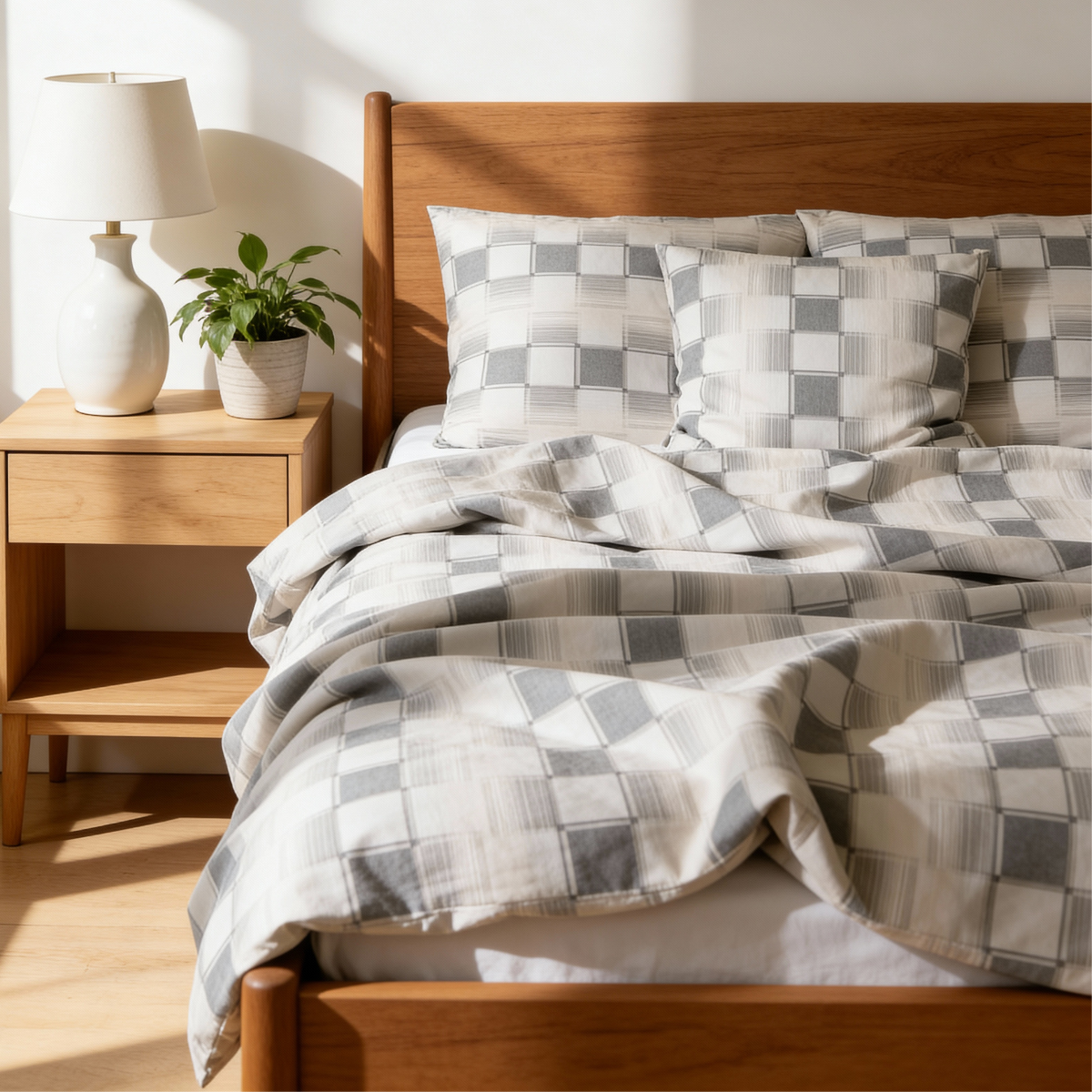 Minimalistisches Design, inspiriert von Schachbrettmustern, in dem Sand- und Grautöne perfekt zu einem modernen oder industriellen Schlafzimmer passen.