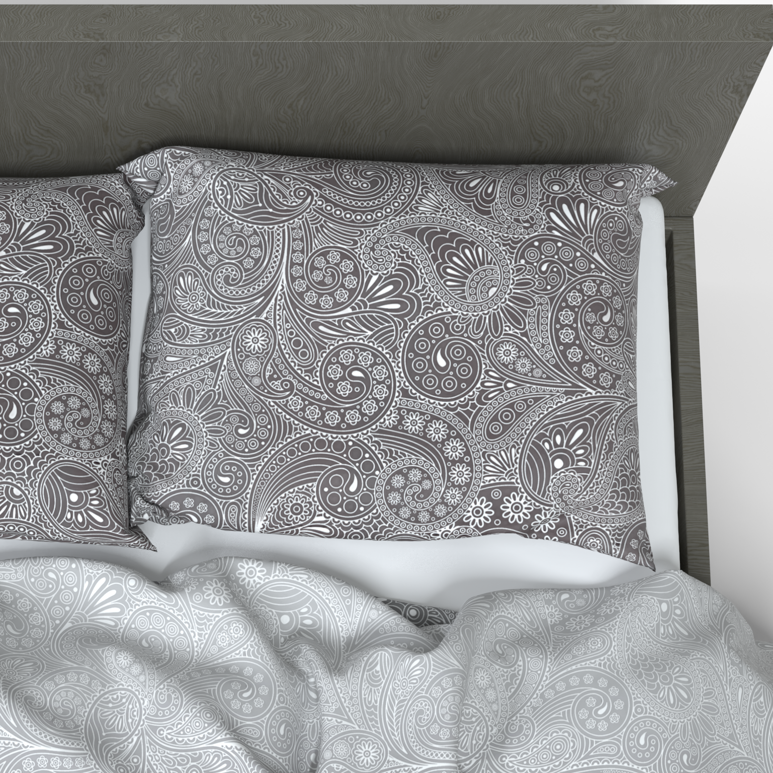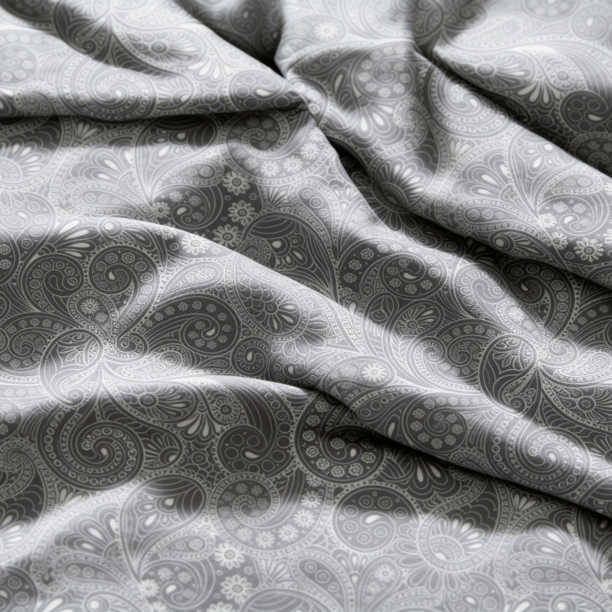 Dieses Deluxe Satin-Baumwoll Bettwäscheset, inspiriert von der Stadt Jaipur, zeichnet sich durch elegante und einzigartige Paisley-Muster aus, die dem Interieur einen besonderen Charme verleihen. Die Kombination aus Grau und Weiß schafft Ruhe und Harmonie in Ihrem Schlafzimmer, damit Sie in einen tiefen und komfortablen Schlaf eintauchen können.