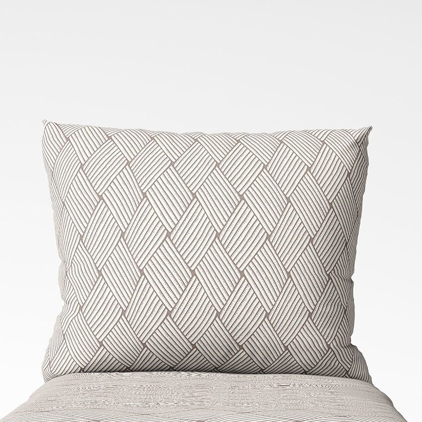 🤎 Sand Weave – Kissenbezug mit natürlichem geometrischem Muster, inspiriert von der Sandstruktur. Seine ruhigen Töne verleihen dem Schlafzimmer Leichtigkeit, während das strukturierte Design ein Gefühl von visueller Stabilität und Ordnung schafft.